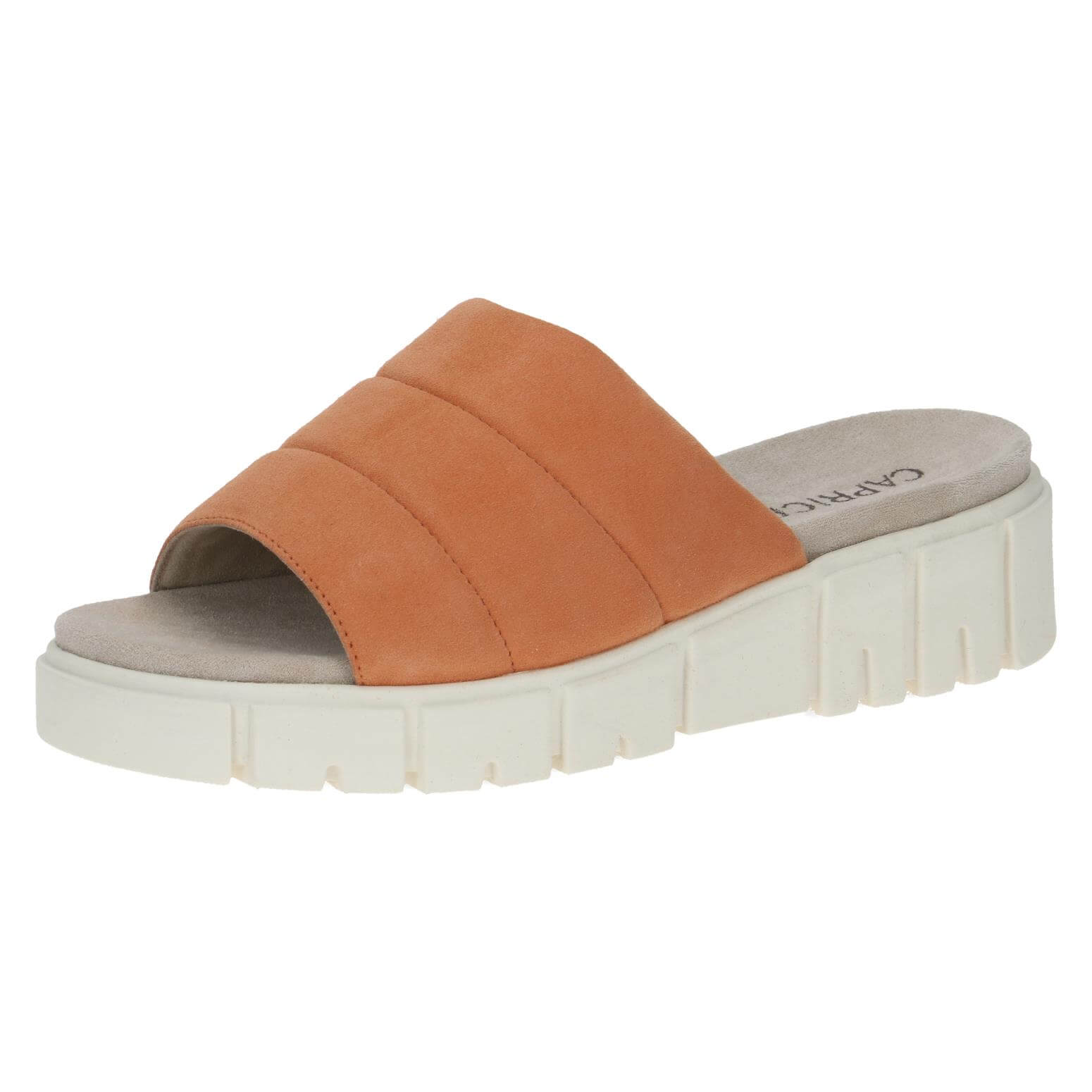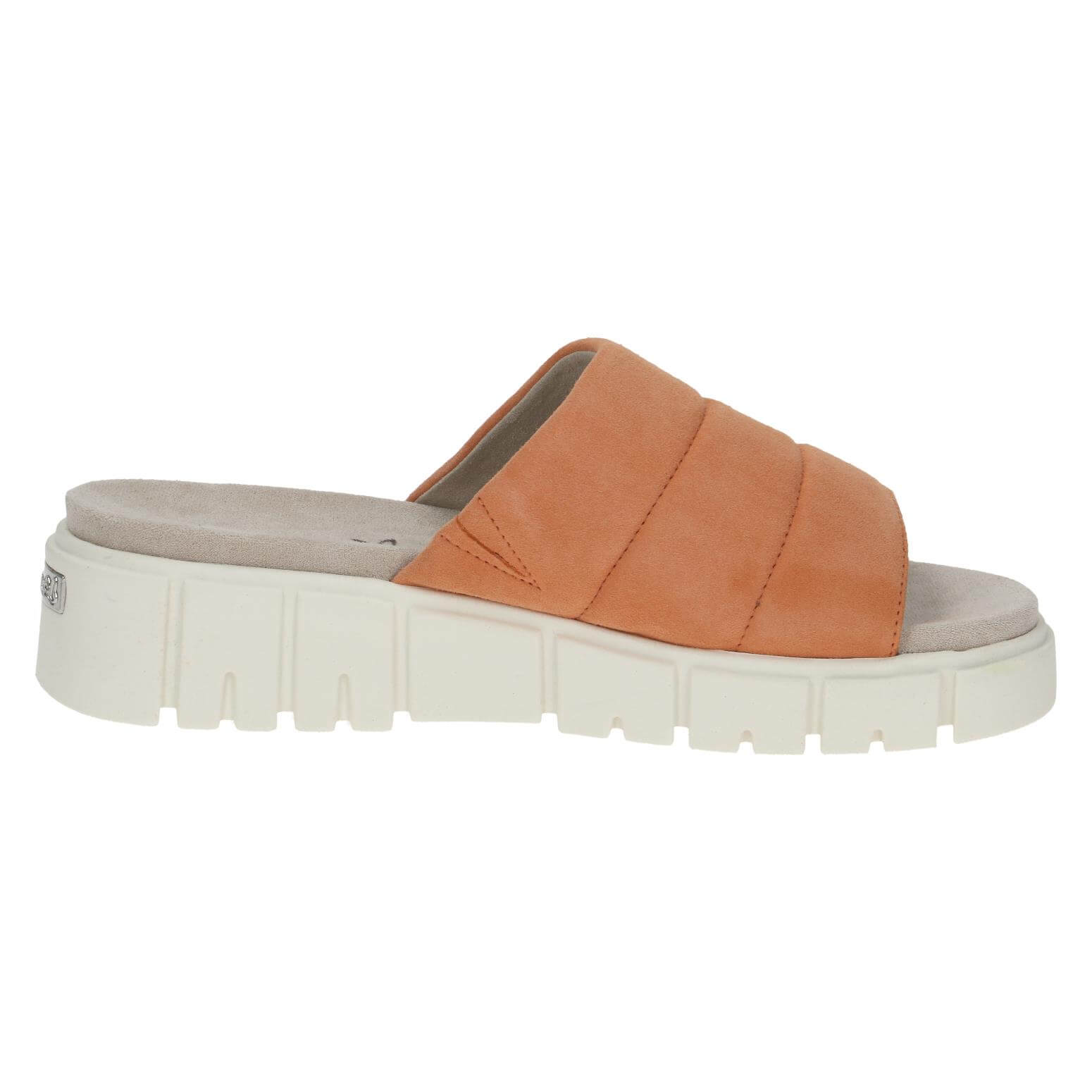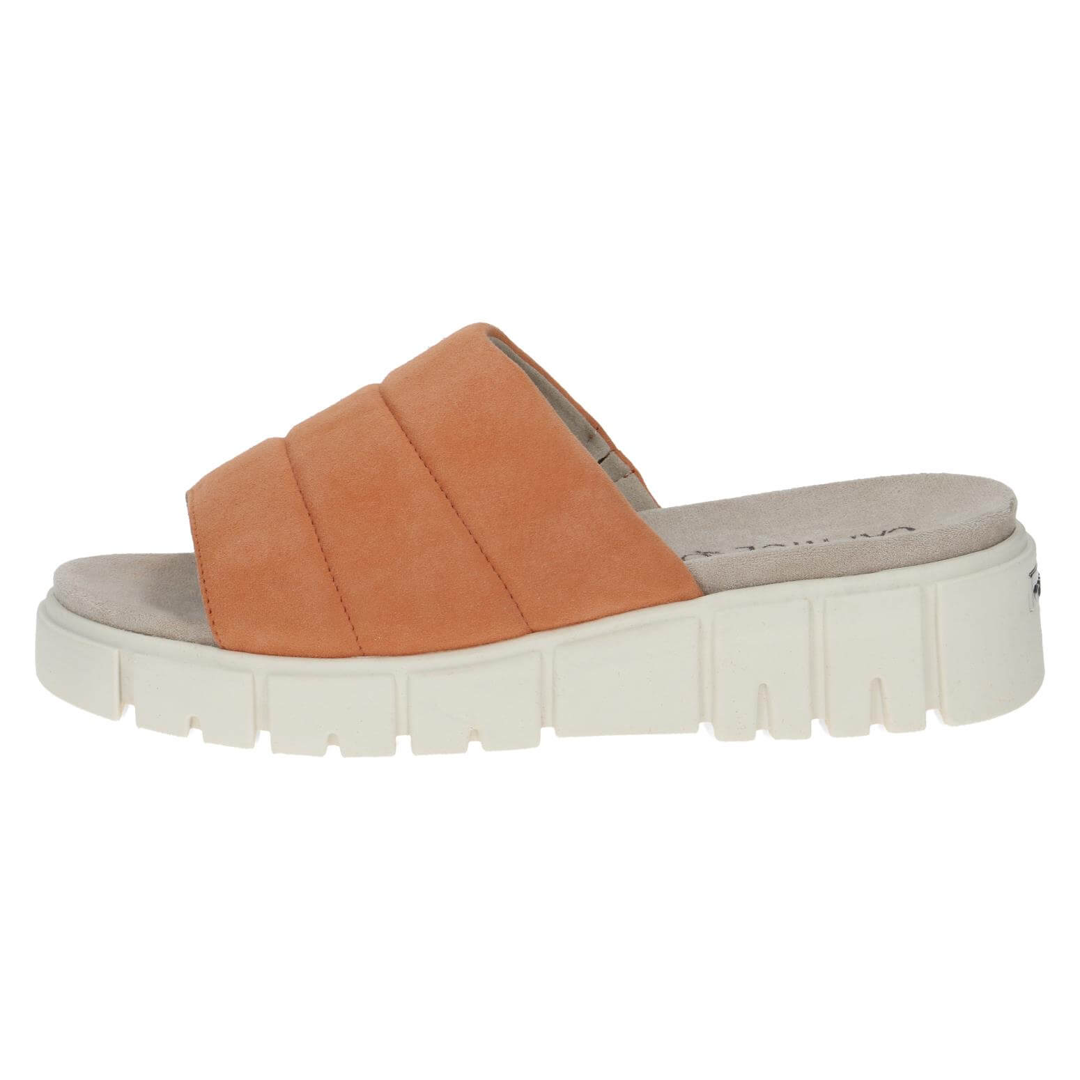 כפכפים עם גפה רחבה על סוליית פלטפורמה צ'אנקית-טרקטור בגובה 4.5 ס"מ, עשויים עור זמשי כתום – לנוכחות מלאה.