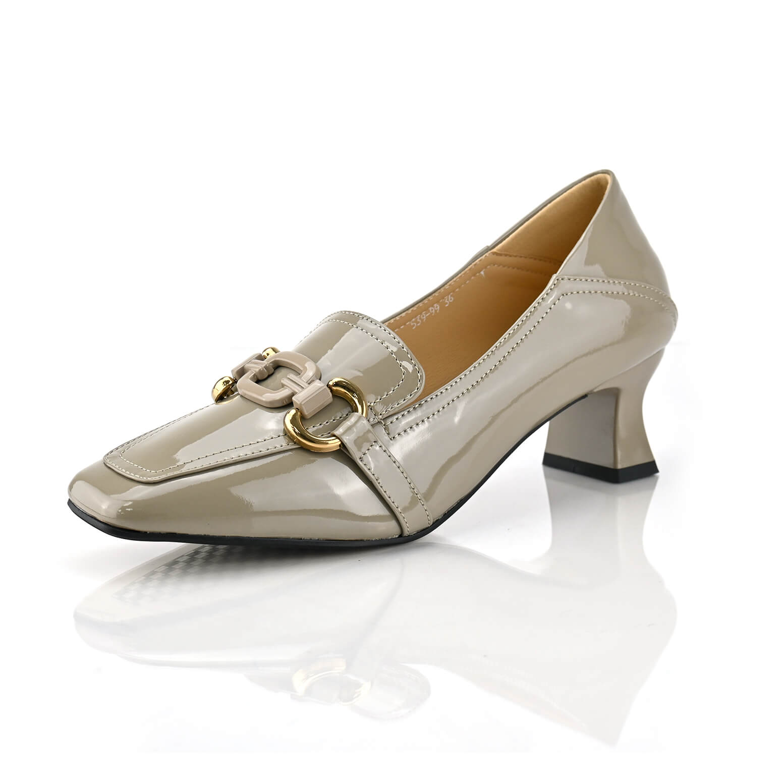 נעלי לכה עם עקב מלבני רחב ויציב ועטיפת אבזם קדמי משולב זהב. מעולות לכל אירוע, עקב בגובה 5.5 ס"מ.