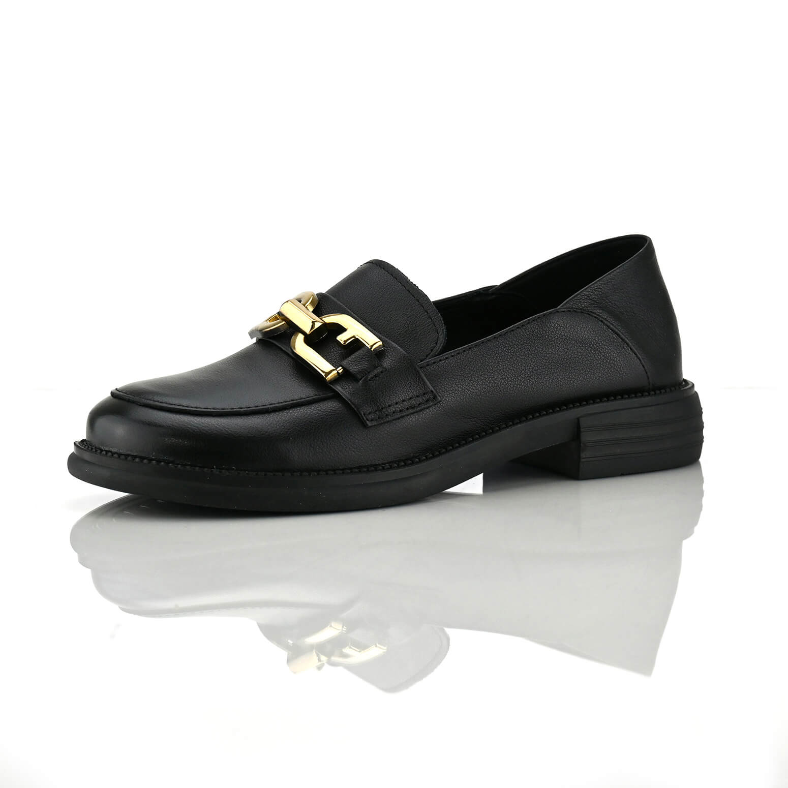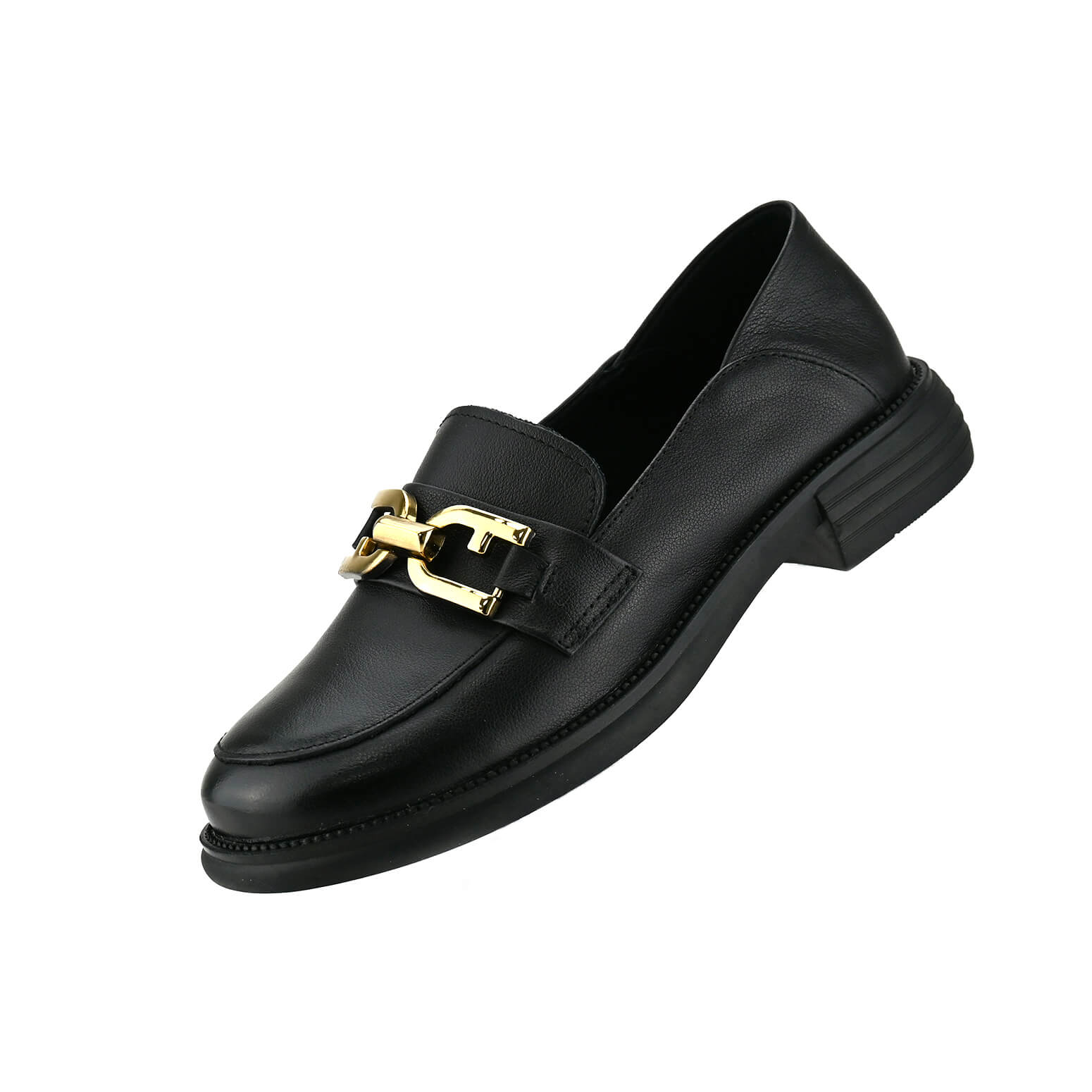 נעלי מוקסין לרגל רחבה, מעוטרות אבזם קדמי זהוב, סיומת קדמית מרובעת קלות, סוליה גמישה ועקב בגובה 3 ס"מ.