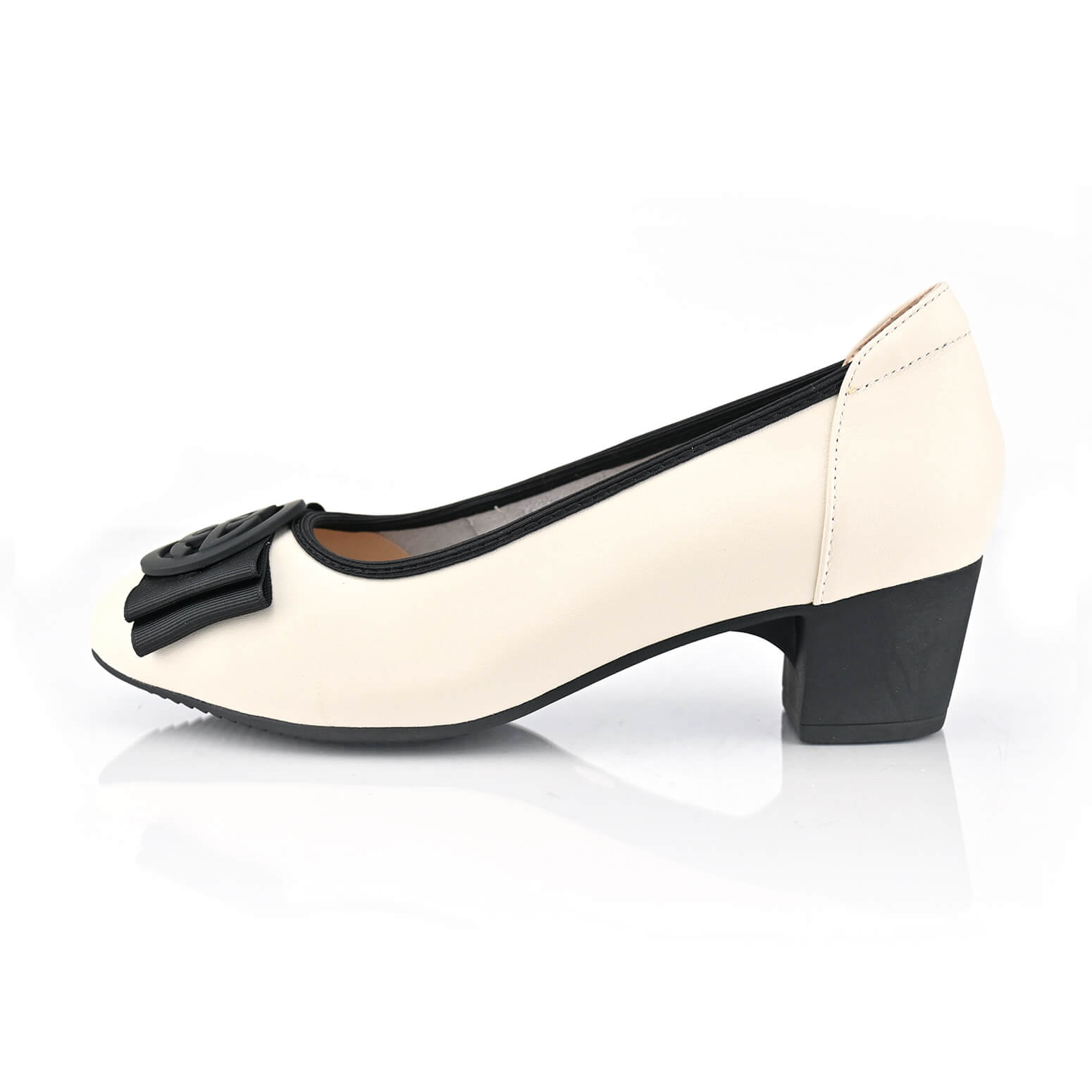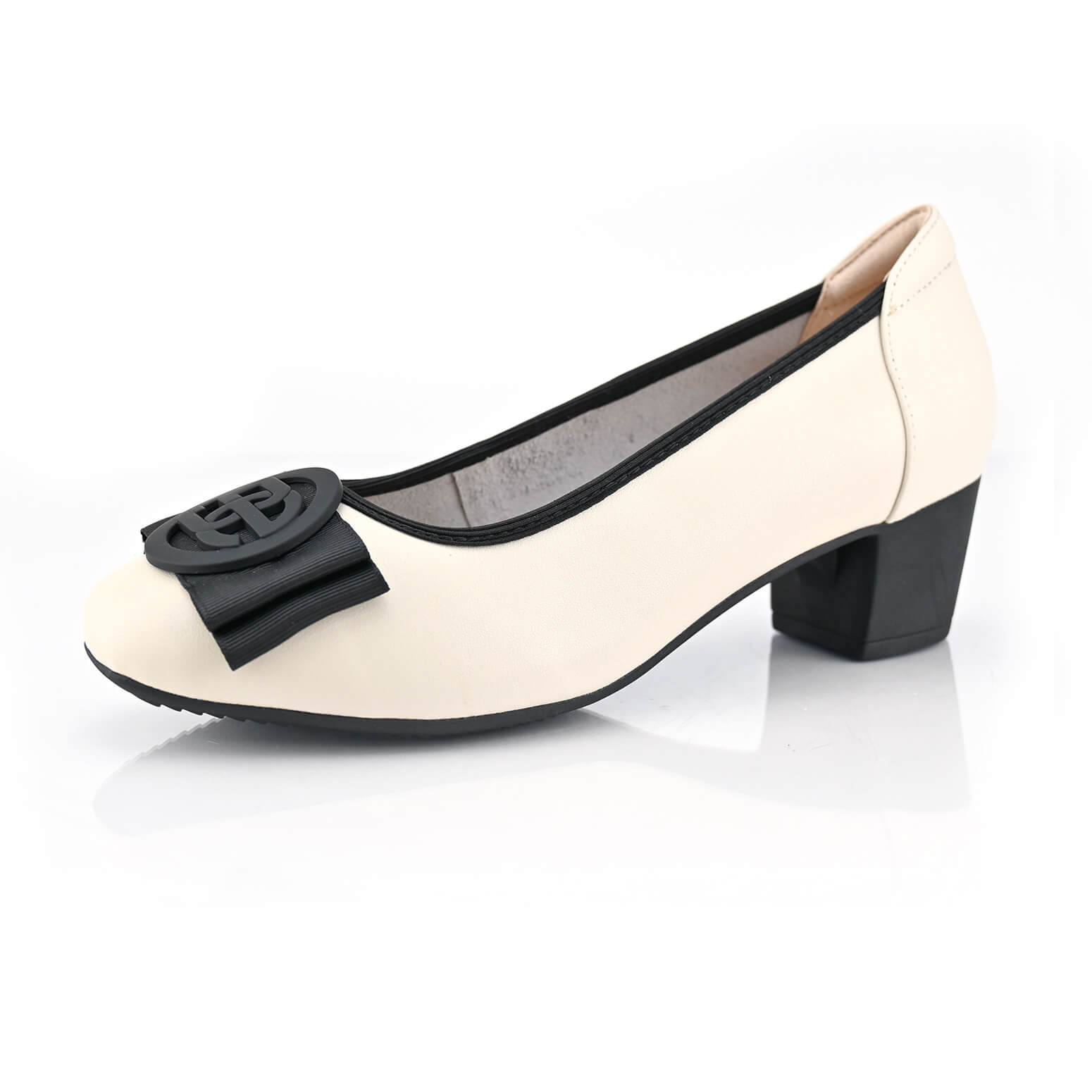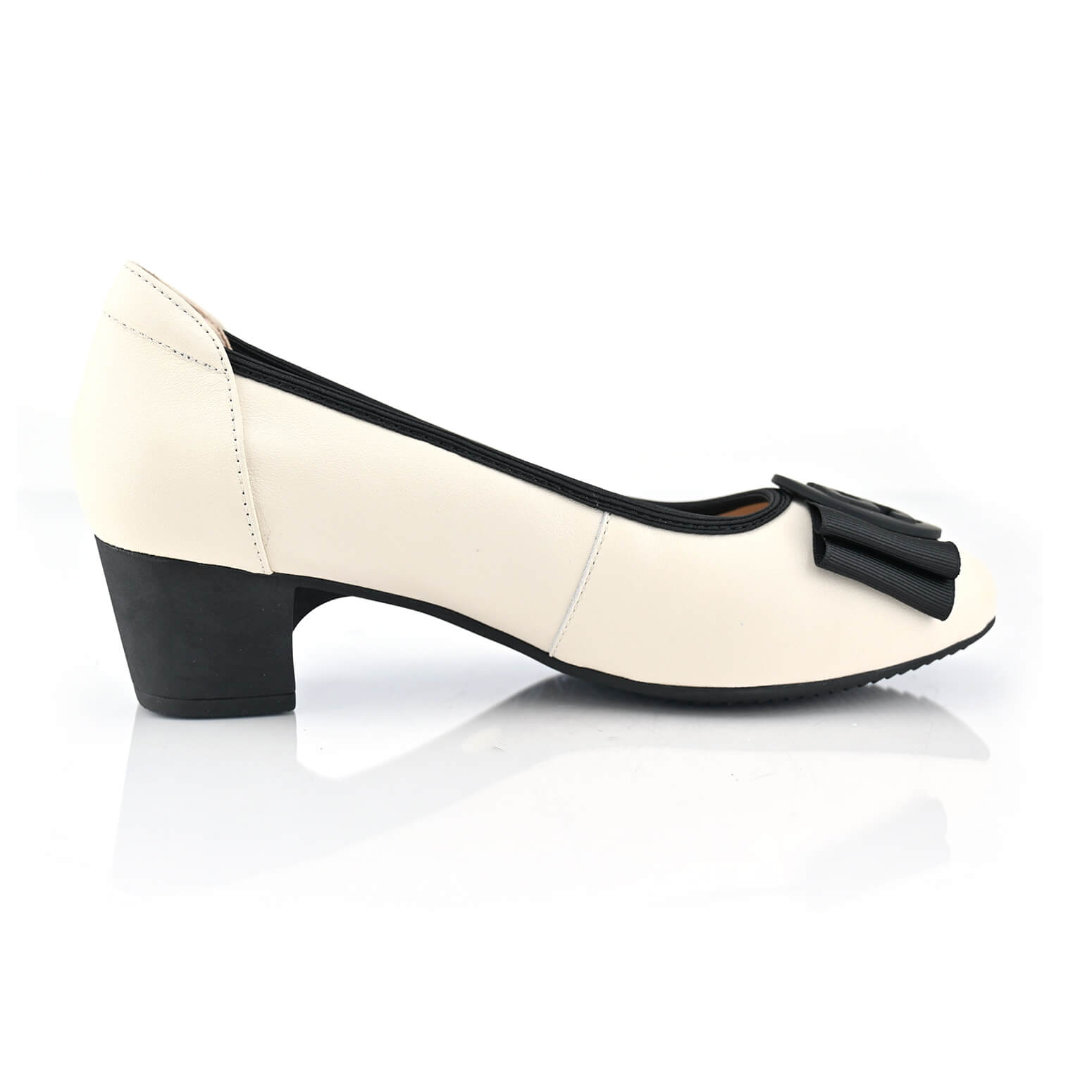 נעלי סירה לבנות קלאסיות עם עקב רחב מעוטרות פפיון כפול. לנעליים רפידת נוחות ועקב חצי סהר רחב ויציב בגובה 5 ס״מ.