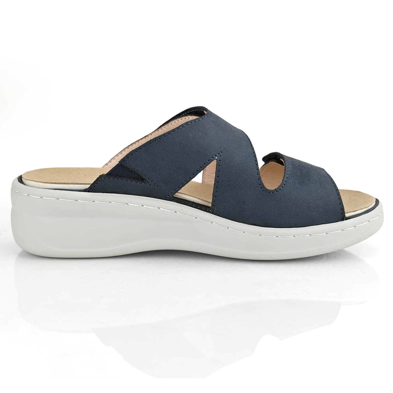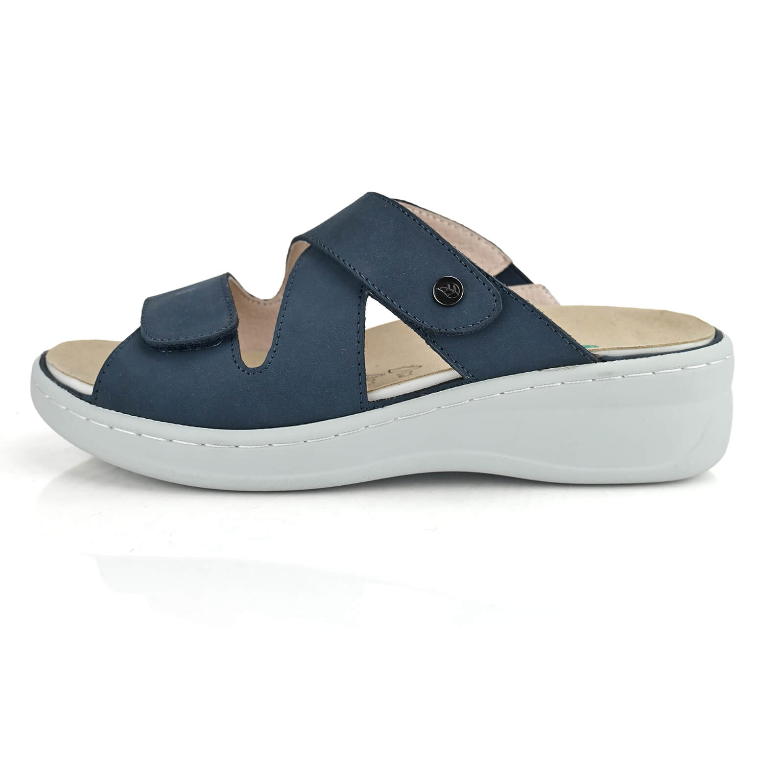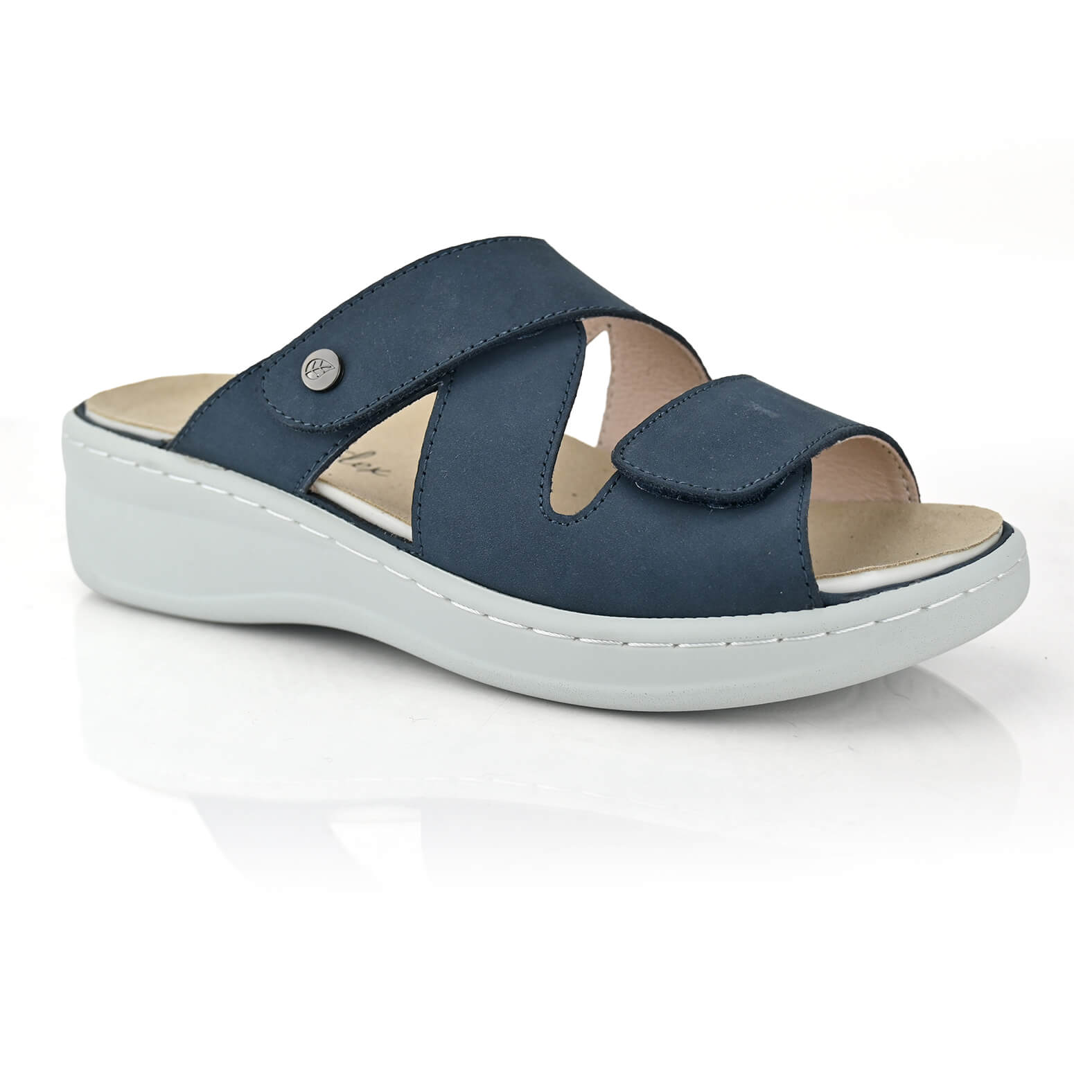 כפכפי Granada של DR.FLEX בצבע כחול, עם שתי רצועות בסגירת סקוטש בגזירה בעיצוב אלכסוני, עשויים עור נפה בצבע כחול. על סולייה יציבה להפחתת לחצים בגובה 4 ס”מ. מאובזרות ברפידות אורטופדיות נשלפות.