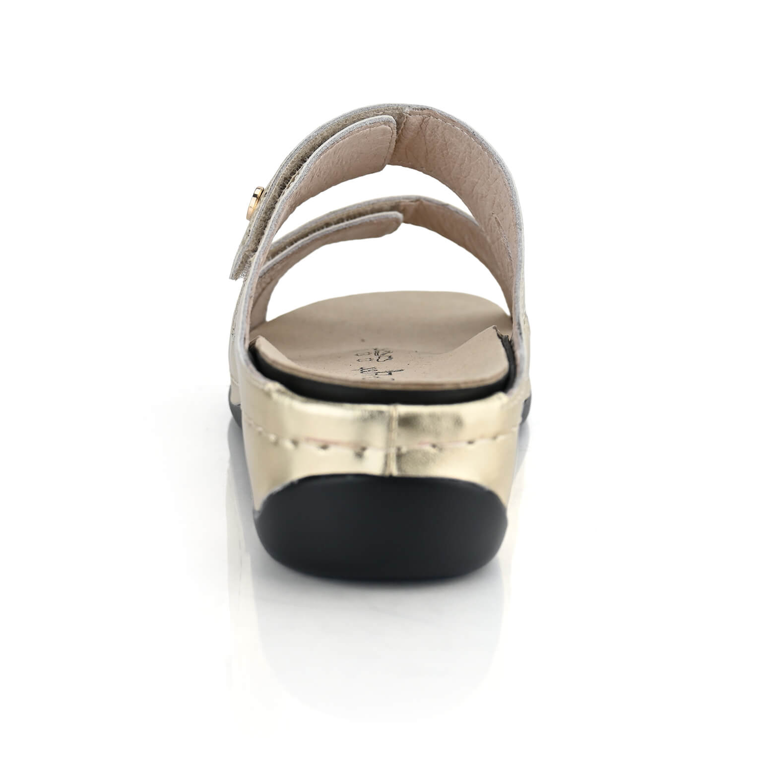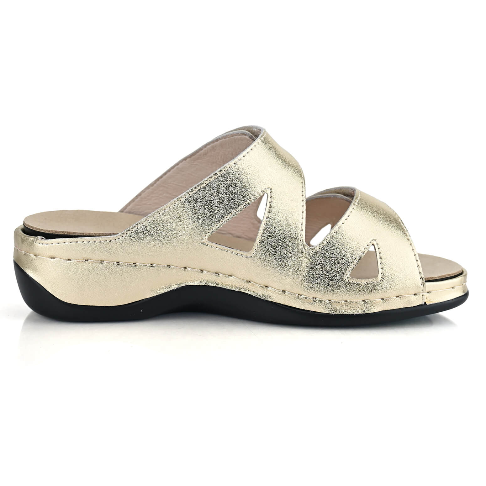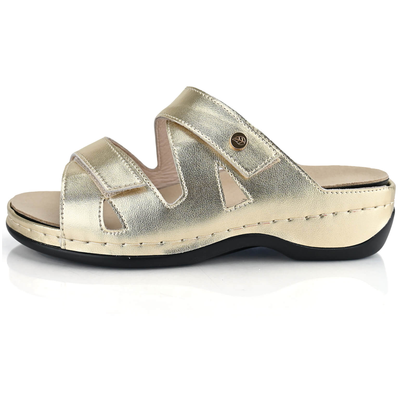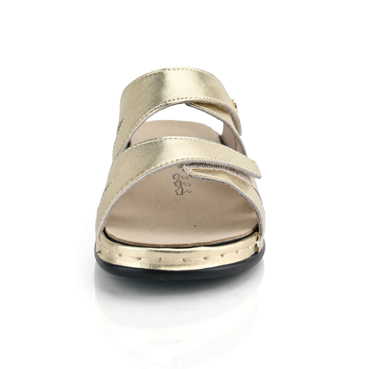 כפכפים לנשים Bruges של DR.FLEX זהב מבריק. כפכפי ברוז׳ בצבע זהב בגימור מבריק על סולייה בגובה 3.5 ס״מ בסגירת סקוטש, עיצוב רצועות משתלבות ועשויים עור איכותי, מגיעים עם רפידה אורטופדית נשלפת – מושלמים למדרסים