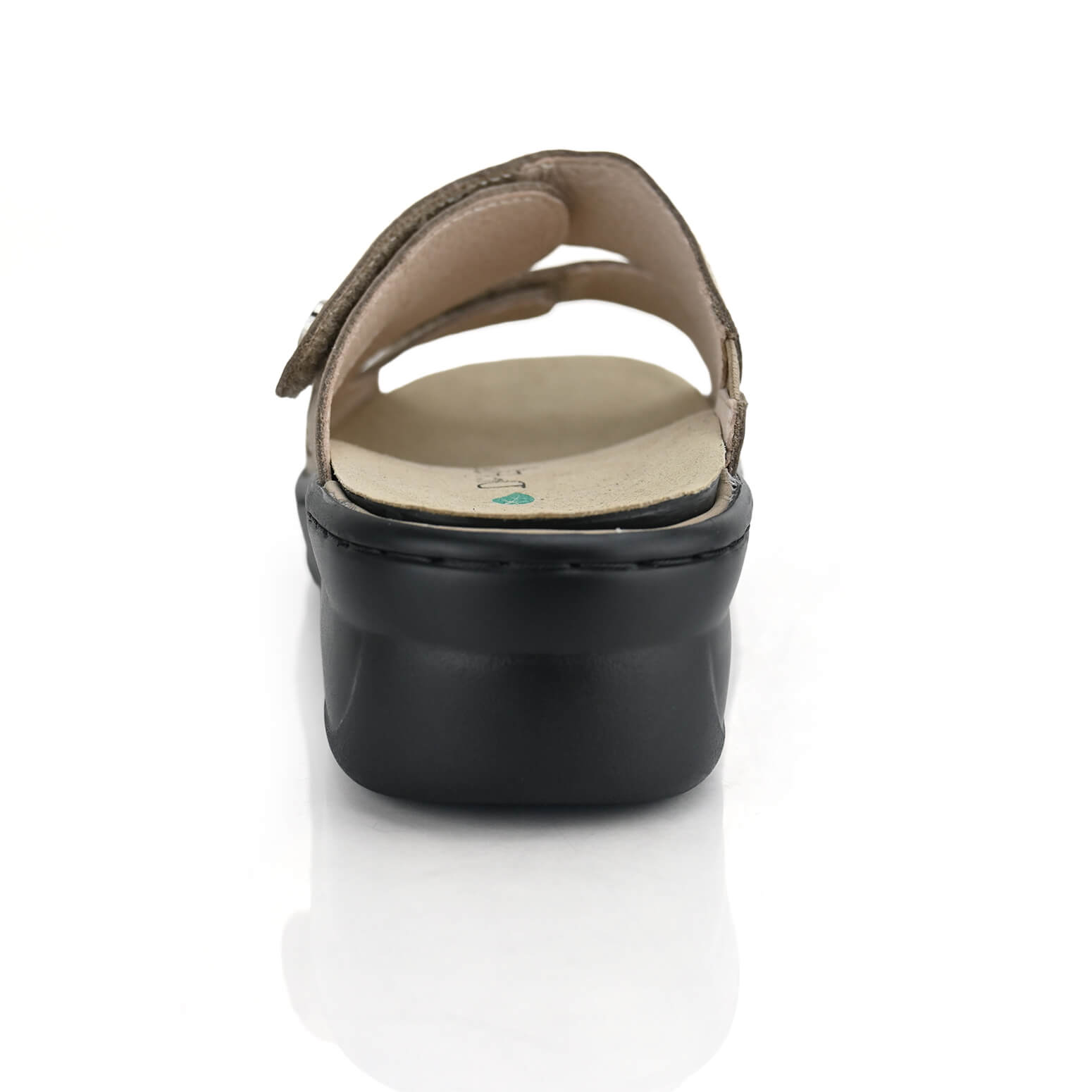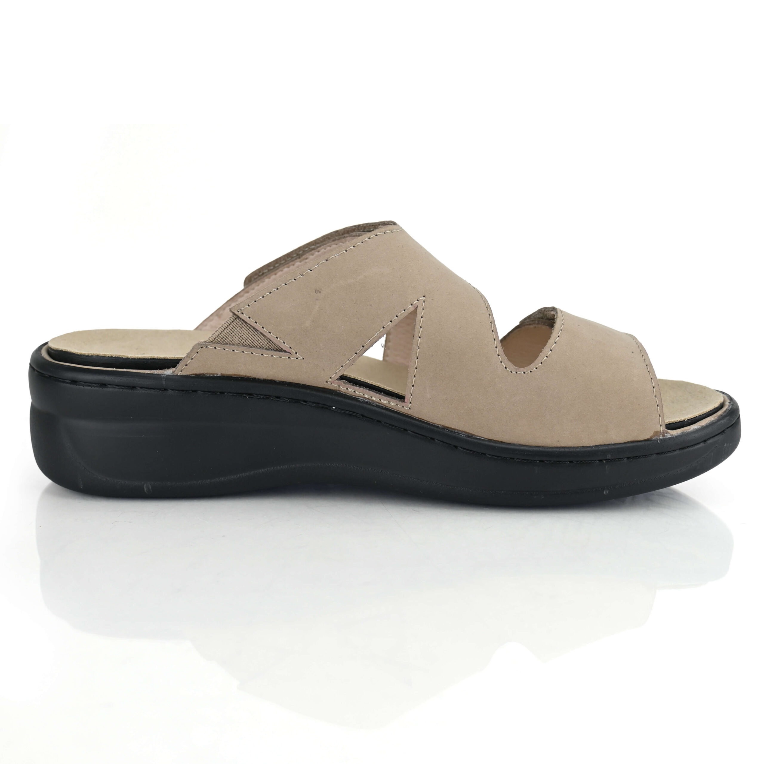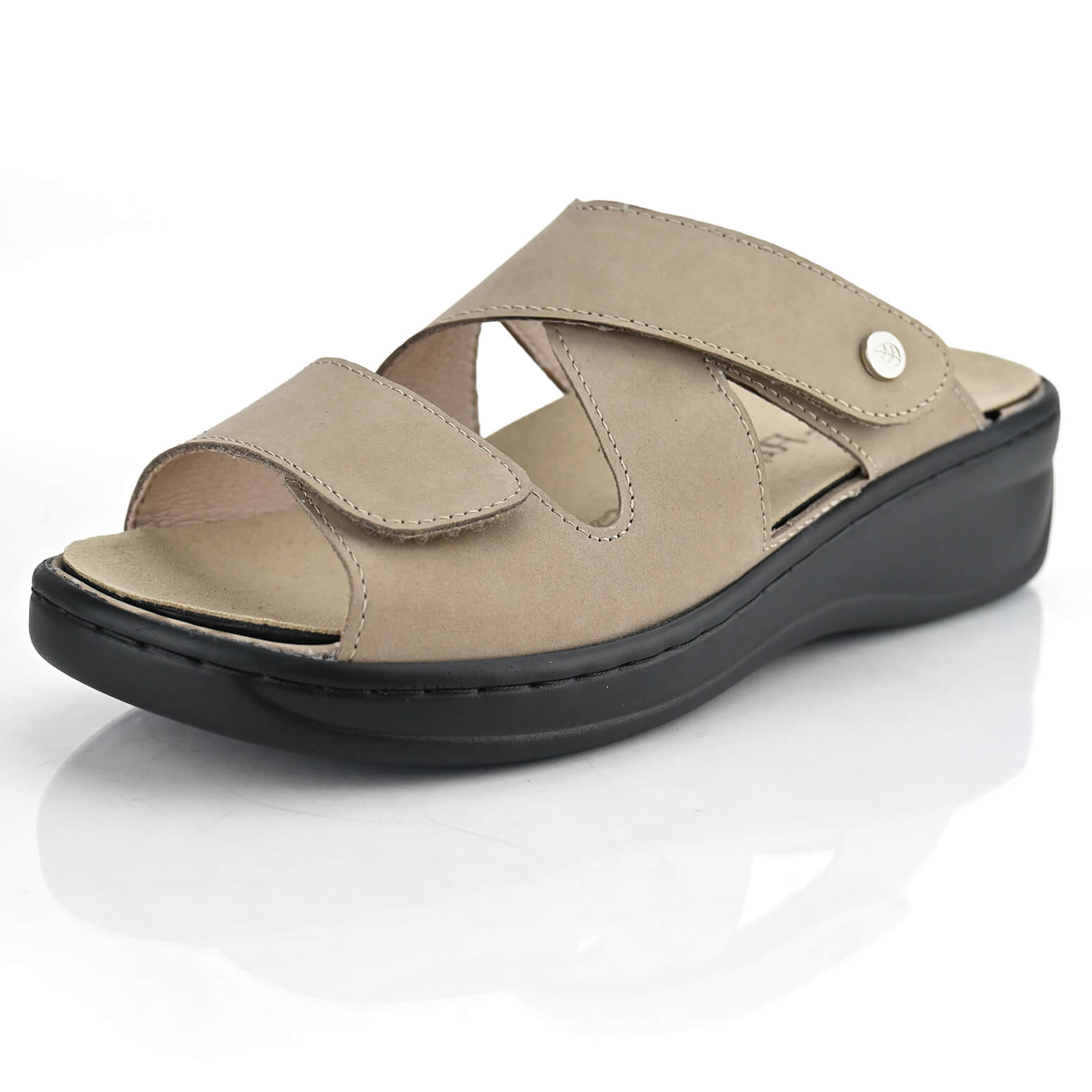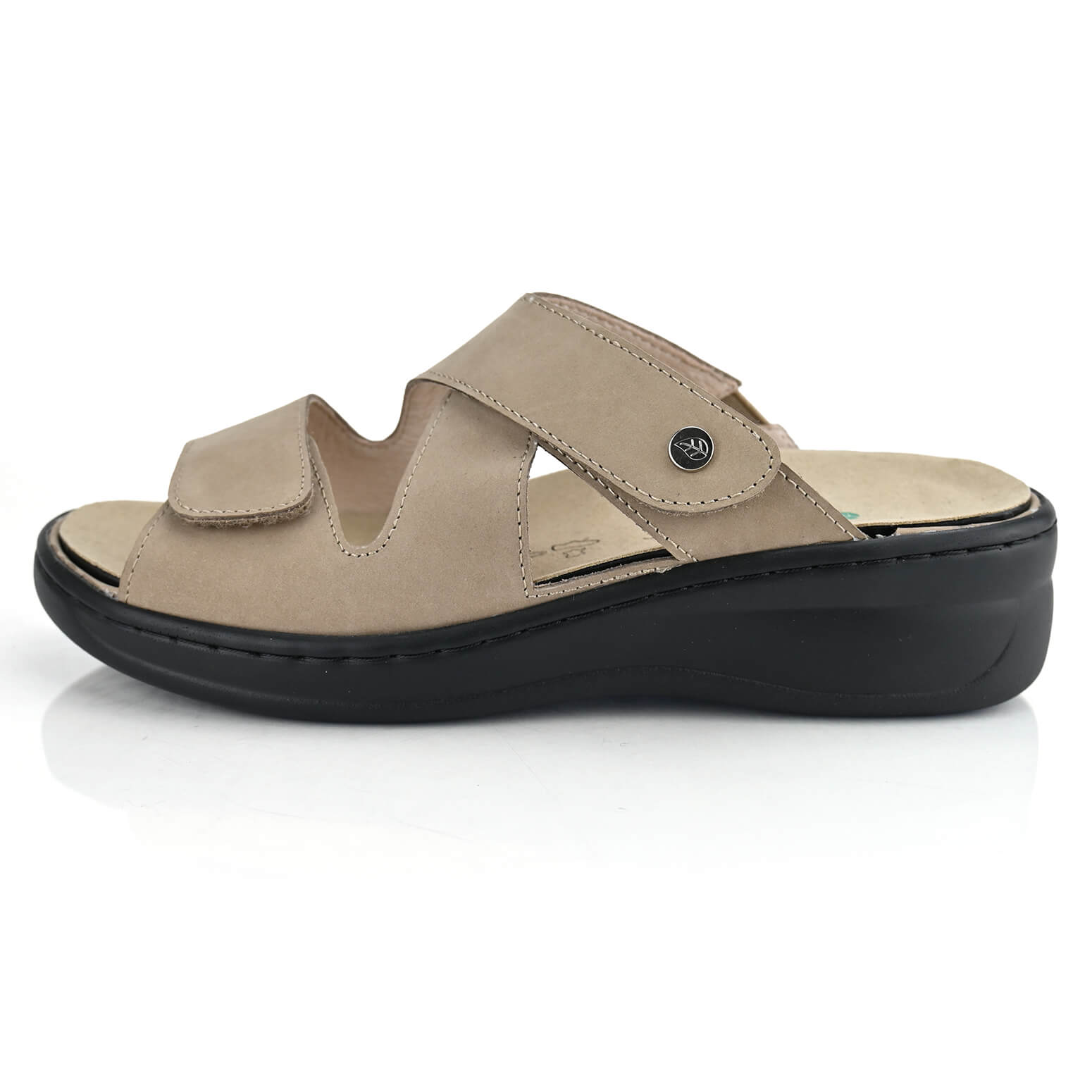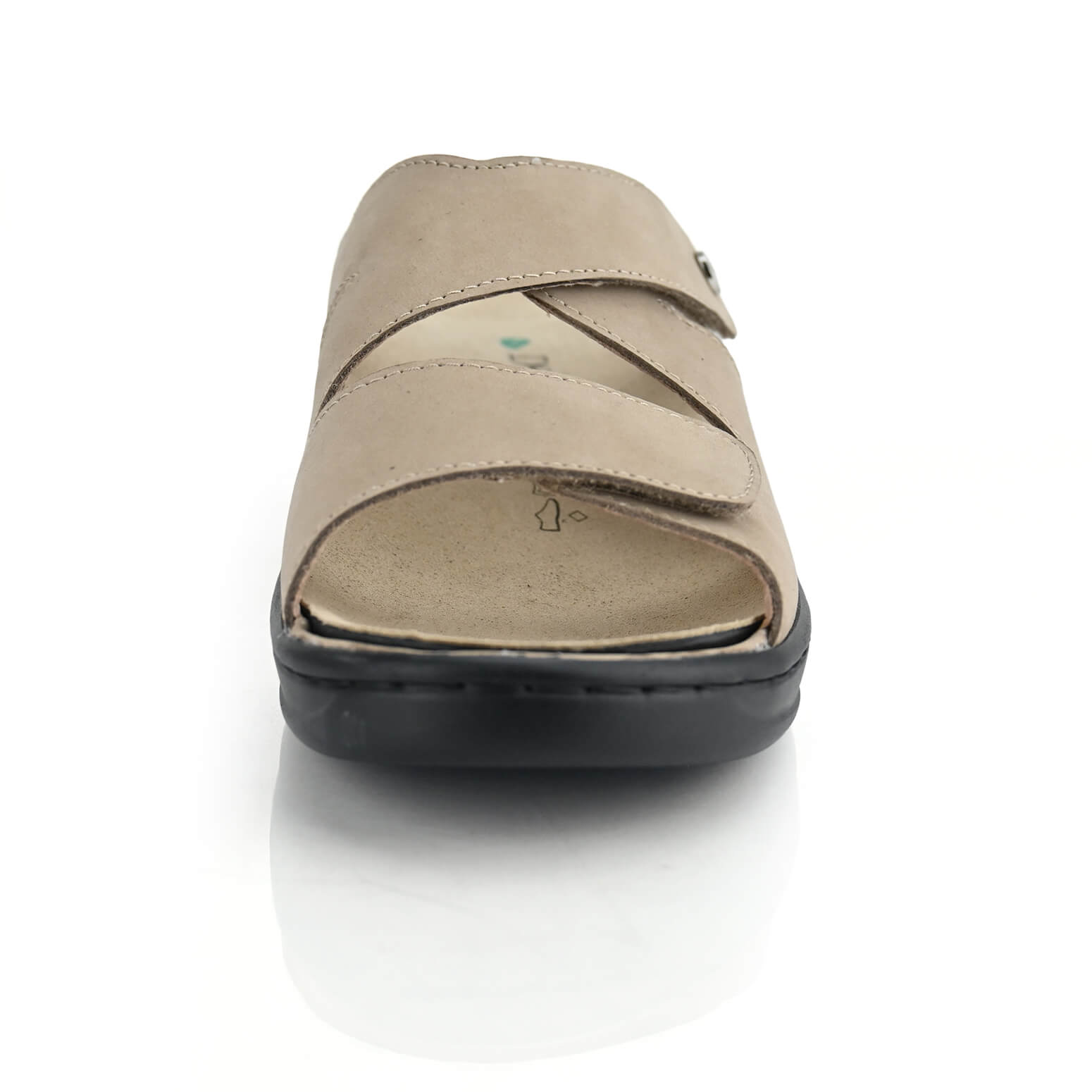 כפכפי Granada של DR.FLEX בצבע חום טאופ, עם שתי רצועות בסגירת סקוטש בגזירה בעיצוב אלכסוני, עשויים עור נפה בצבע חום טאופ. על סולייה יציבה להפחתת לחצים בגובה 4 ס”מ. מאובזרות ברפידות אורטופדיות נשלפות