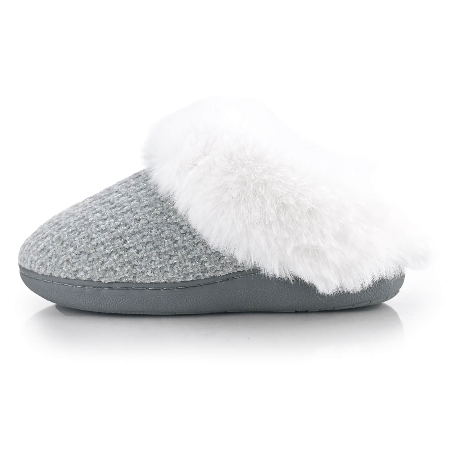 נעלי בית אלבמה בצבע אפור בהיר נעליים במראה סרוג בשילוב פרווה מלטפת שעושה חשק להתכרבל בתוכה, יפייפיות ומחזיקות את הרגל – פינוק אמיתי על סוליה בגובה 3.5 ס"מ