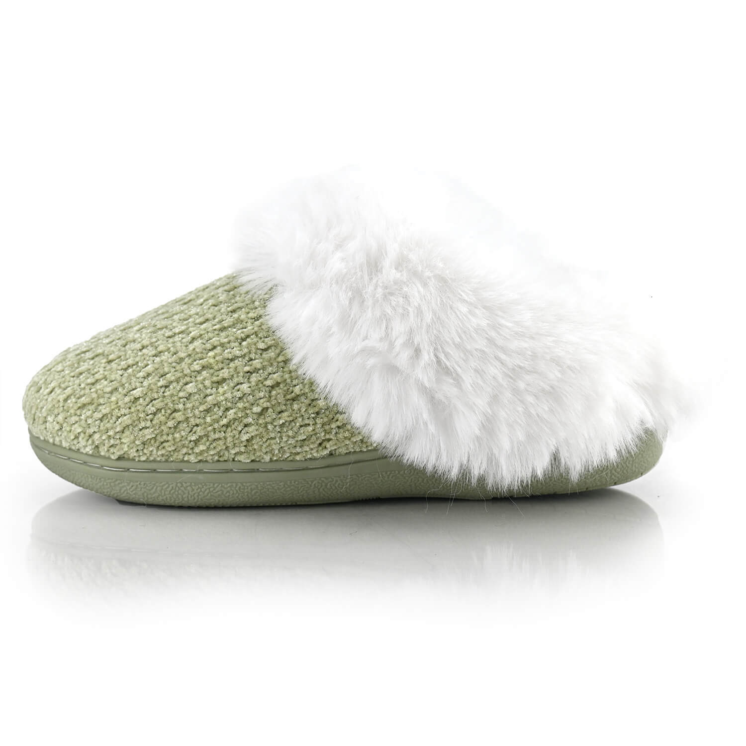נעלי בית אלבמה בצבע פיסטוק נעליים במראה סרוג בשילוב פרווה מלטפת שעושה חשק להתכרבל בתוכה, יפייפיות ומחזיקות את הרגל – פינוק אמיתי על סוליה בגובה 3.5 ס"מ
