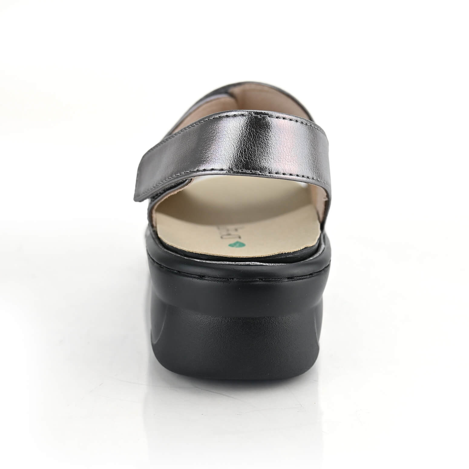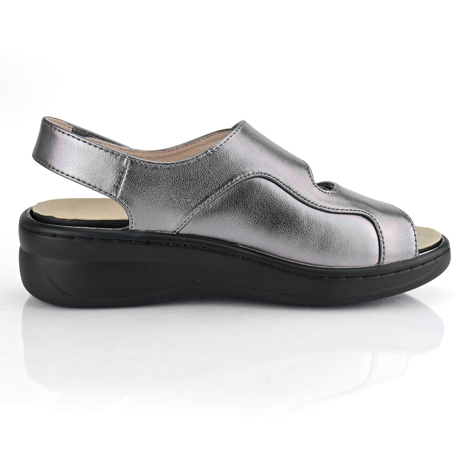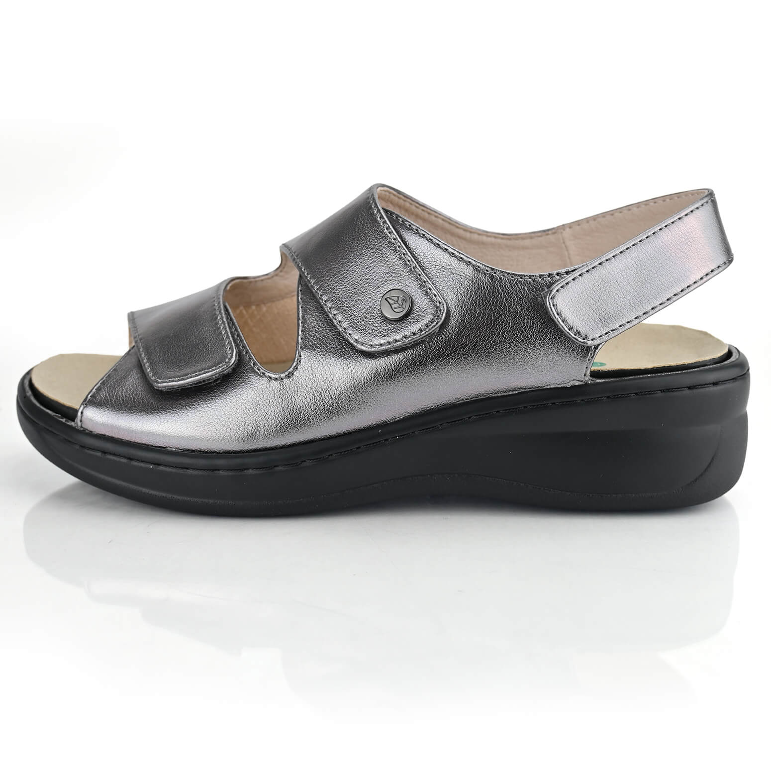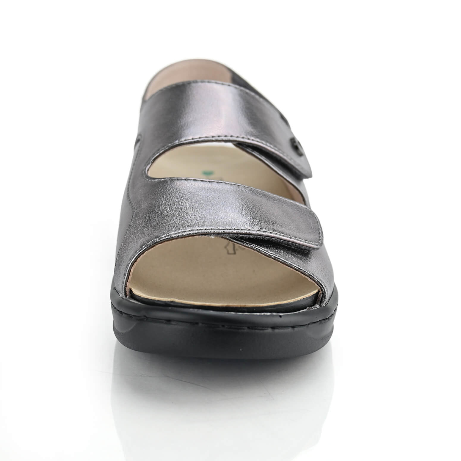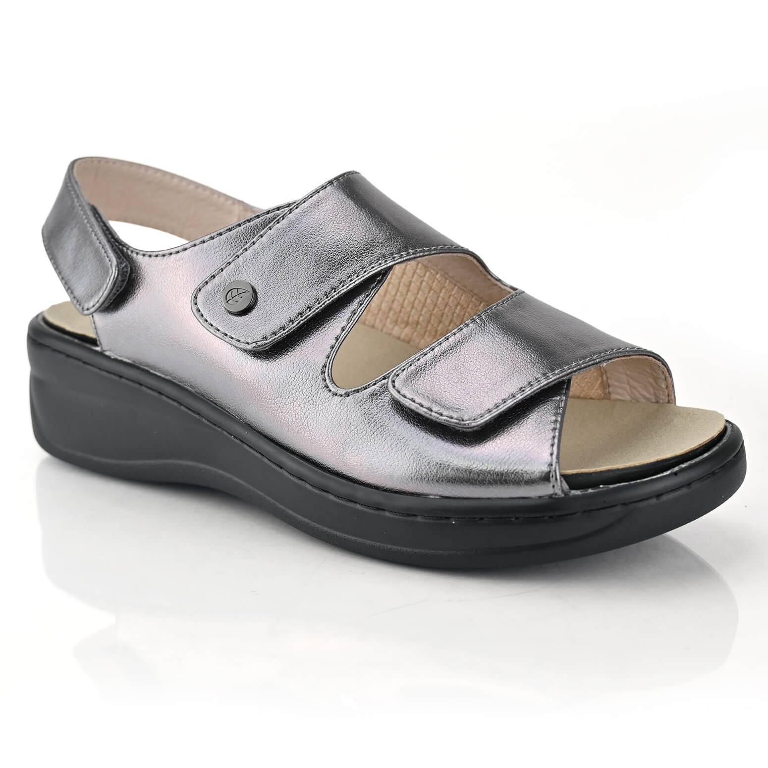 סנדלים לנשים Malaga של DR.FLEXֿ, סנדלי מלאגה בצבע מטאלי, עם שתי רצועות סקוטש קדמיות ורצועה אחורית לאחיזה מושלמת. עשויים עור נפה איכותי, בטנת עור משולב עם ריפוד באיזור ההלוקס ולגוס. מאובזרות ברפידות אורטופדיות נשלפות – מעולה בהתאמת מדרסים אישיים