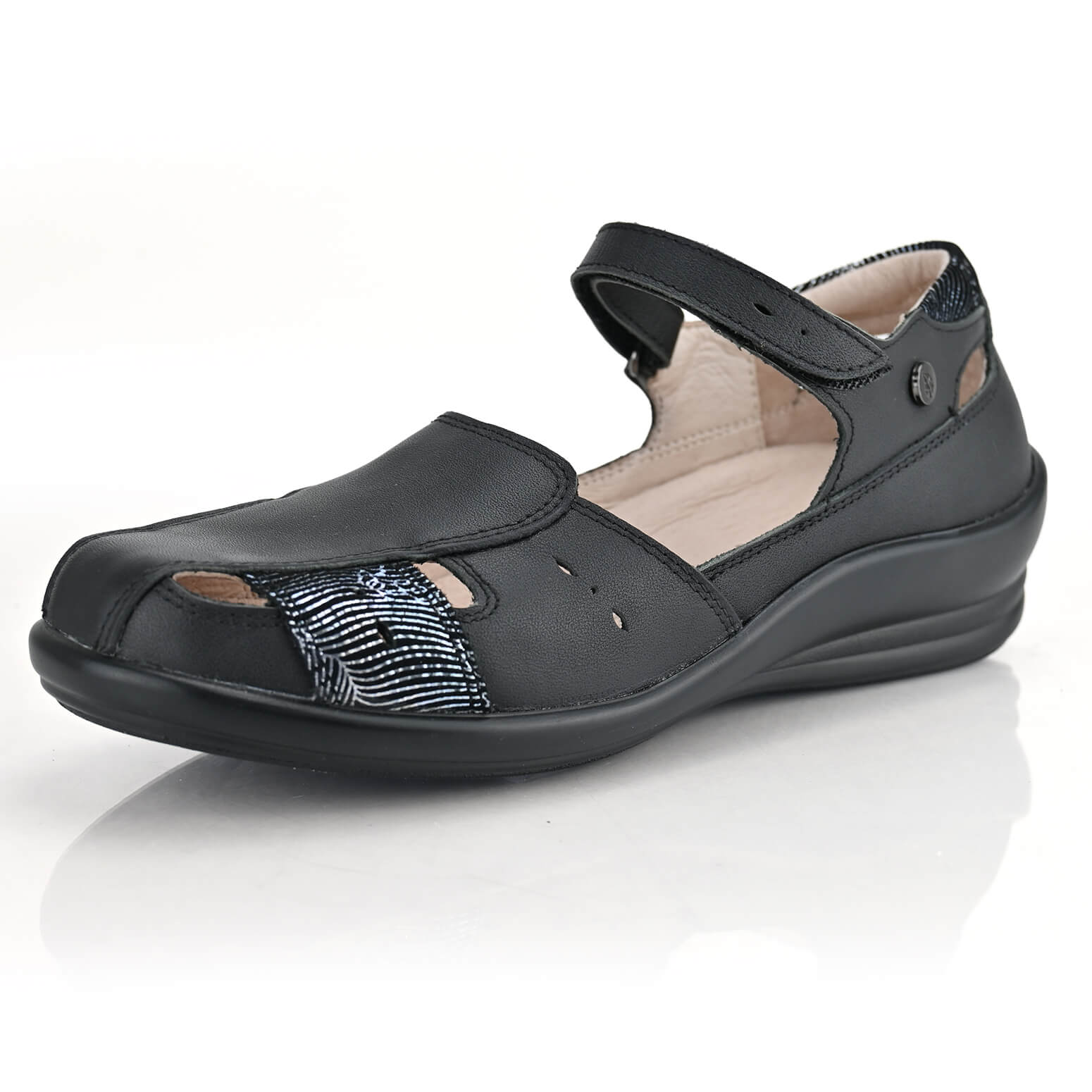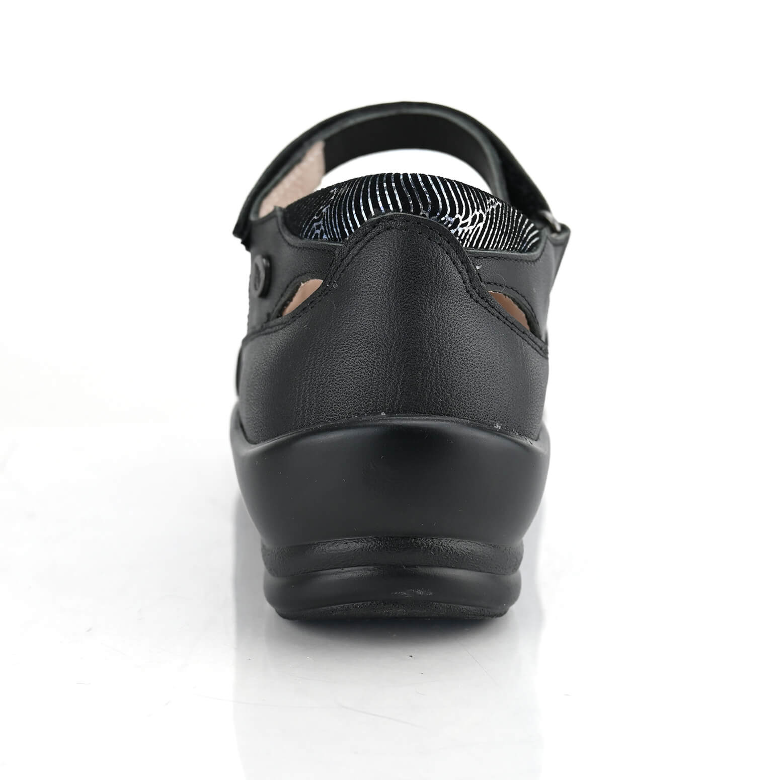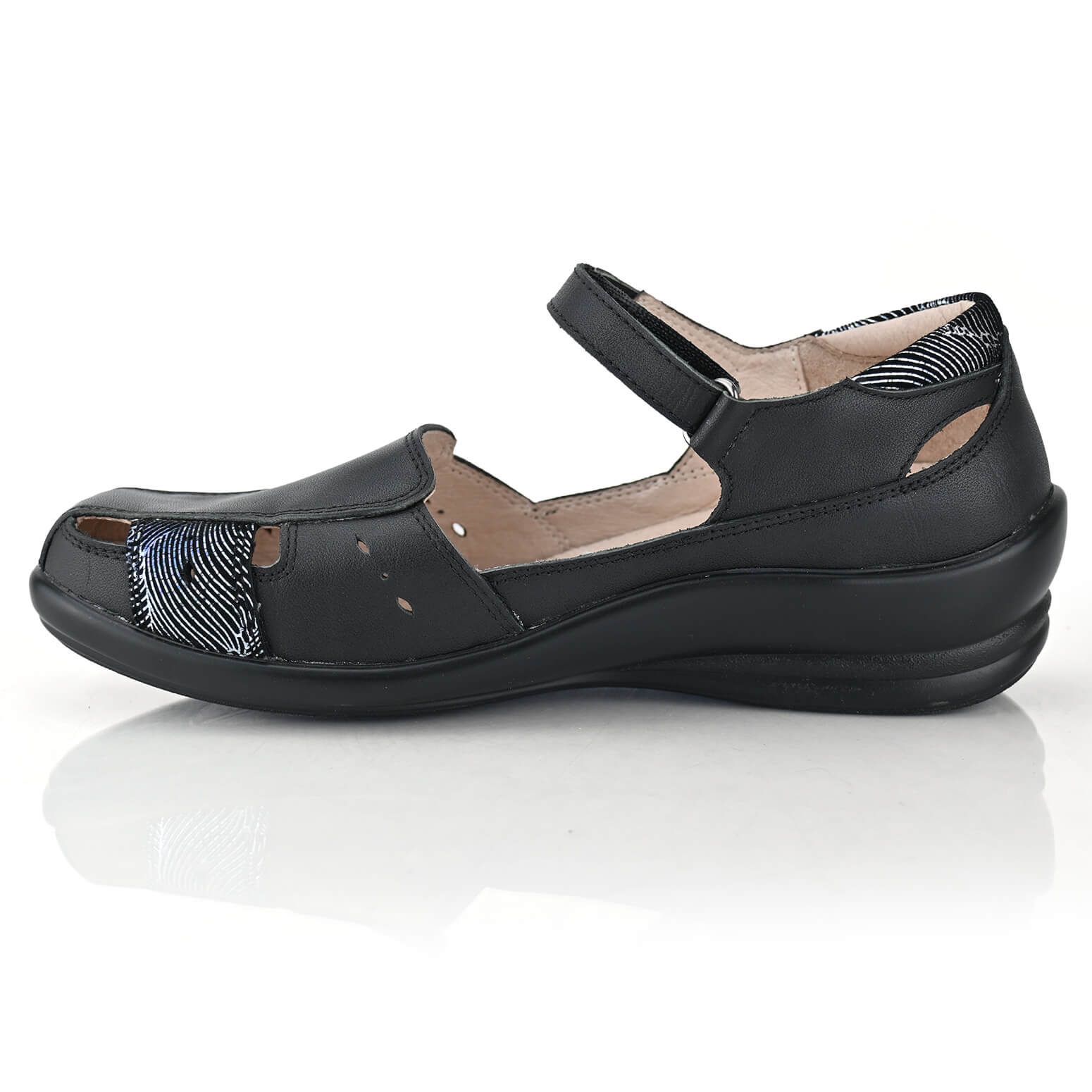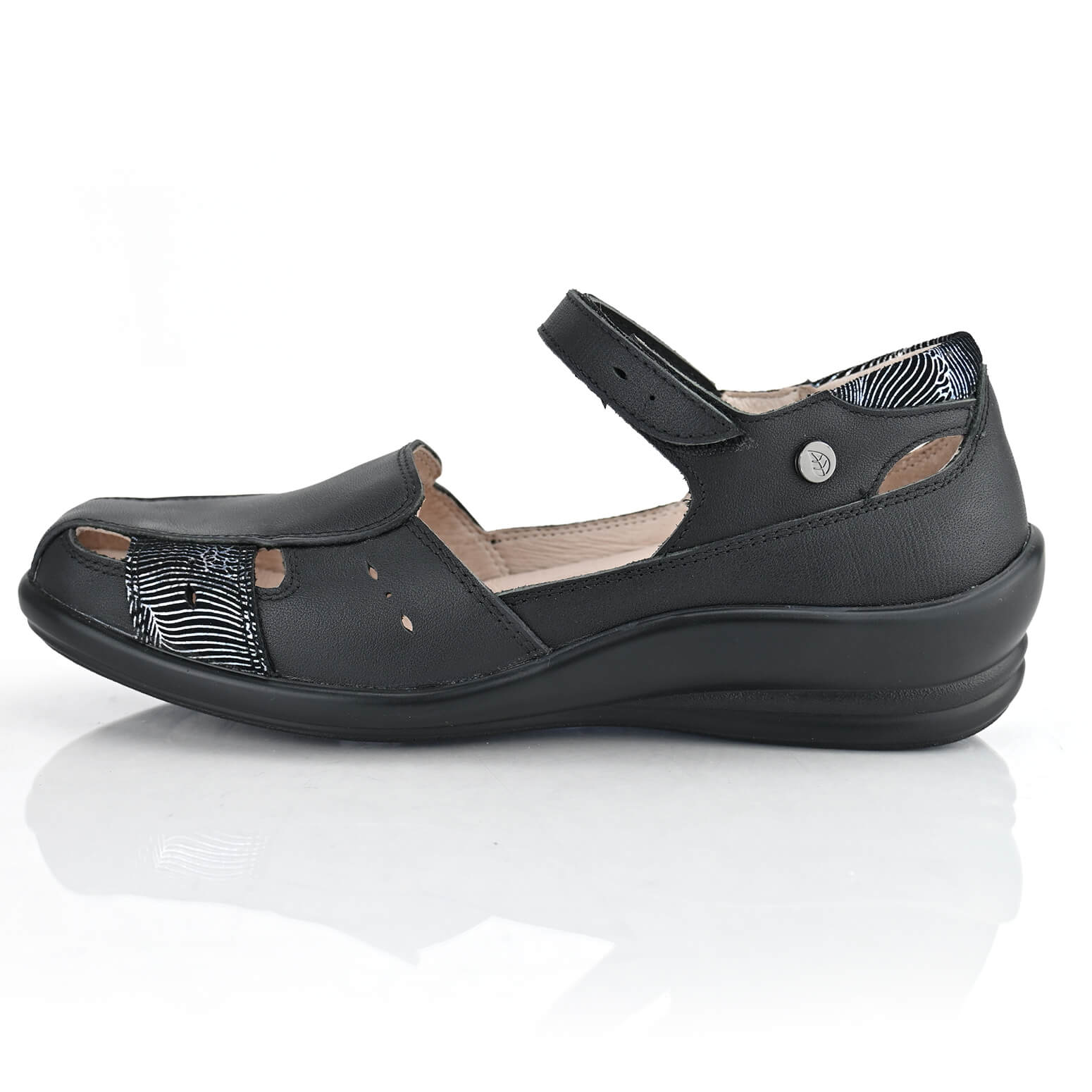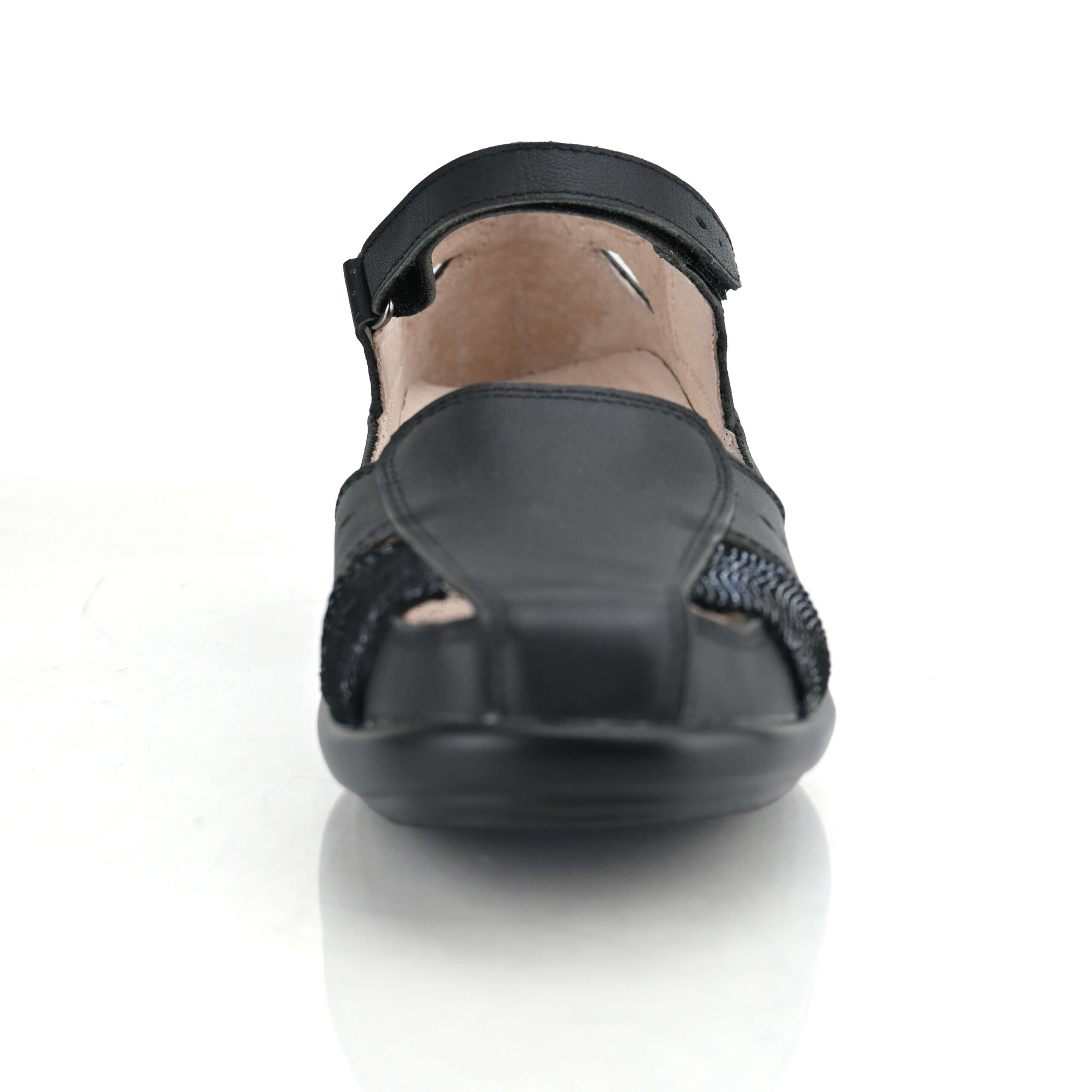 סנדלי Venice של DR.FLEX בצבע שחור עם פטרן כסוף, סנדלים אורטופדים מבית ד"ר פלקס סגורים מלפנים גם רצועת סקוטש עדינה מסביב לקרסול. מאובזרים ברפידה נשלפת עשוים עור נפה בצבע שחור עם פטרן כסוף.